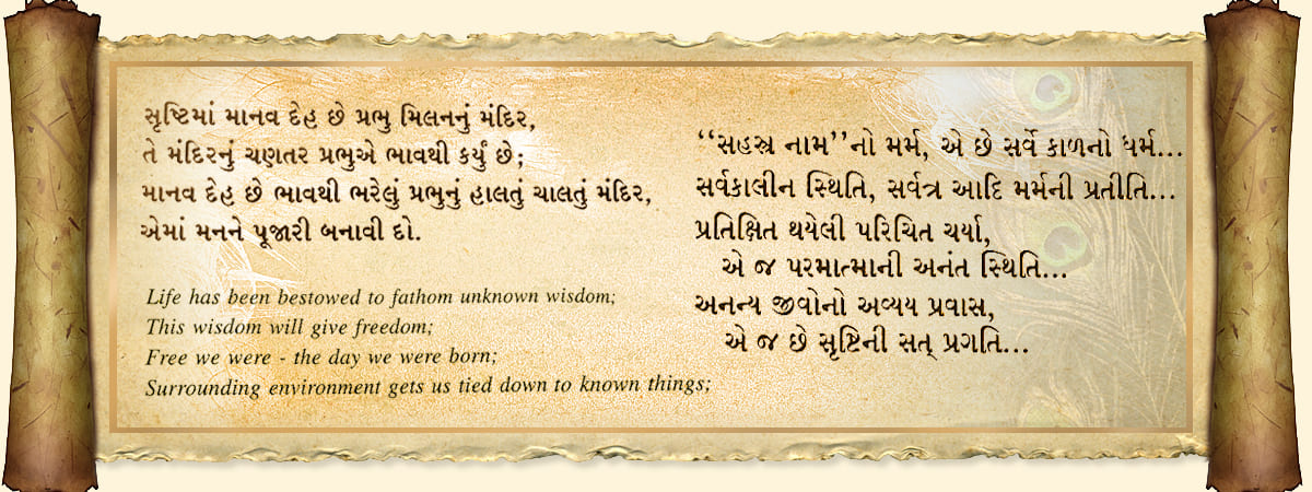 …અંતર ભક્તિની પ્રસન્નતા માણવા માટે જ મનુષ્ય દેહનું દાન અર્પણ થયું છે. એ જાણીને તે દાનનો આશય પૂરો થાય એવી જાગૃતિનું જીવન આપની કૃપાથી જિવાય છે. હવે કાંટા અને ગુલાબની ભિન્નતા નથી જણાતી. કારણ કાંટા અને ગુલાબની એકરૂપતા હોવાથી ગુલાબના ફુલનું રંગીન, સુગંધી સૌંદર્ય પ્રગટે છે. એવી સત્ બોધની ધારામાં આપ તરાવો છો, એટલે તો હું તુંજમાં ઓગળતો જાઉ છું, સમાતો જાઉં છું. આપનો જ આધાર છે અને આપના આધારના લીધે આ જગતમાં કોઈ નિરાધાર નથી. એવા અહોભાવમાં ચિંતા, ભય, અસુરક્ષાના નકારાત્મક વિચારો વિલીન થઈ જાય છે. આપની સાક્ષાત્ પ્રતીતિ પાસની ક્રિયા રૂપે, પાસના સંગમાં થયાં કરે છે. ઘાસની ચેતના રૂપે આપની દિવ્ય પ્રીતની ધારા અર્પણ થાય છે. પરંતુ મનુષ્ય કર્મસંસ્કારોનું આવરણ આ પ્રીતની ધારાને પૂર્ણતાથી ઝીલી શકતું નથી...