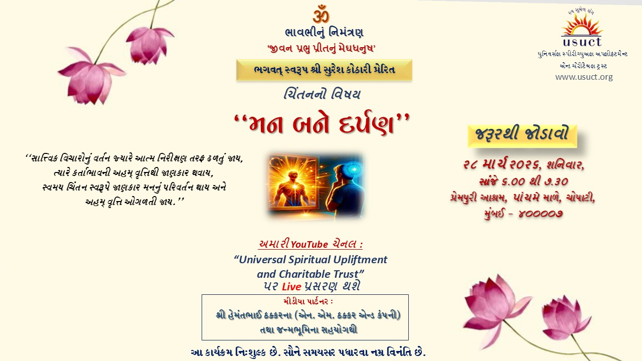 …અંતર ભક્તિની પ્રસન્નતા માણવા માટે જ મનુષ્ય દેહનું દાન અર્પણ થયું છે. એ જાણીને તે દાનનો આશય પૂરો થાય એવી જાગૃતિનું જીવન આપની કૃપાથી જિવાય છે. હવે કાંટા અને ગુલાબની ભિન્નતા નથી જણાતી. કારણ કાંટા અને ગુલાબની એકરૂપતા હોવાથી ગુલાબના ફુલનું રંગીન, સુગંધી સૌંદર્ય પ્રગટે છે. એવી સત્ બોધની ધારામાં આપ તરાવો છો, એટલે તો હું તુંજમાં ઓગળતો જાઉ છું, સમાતો જાઉં છું. આપનો જ આધાર છે અને આપના આધારના લીધે આ જગતમાં કોઈ નિરાધાર નથી. એવા અહોભાવમાં ચિંતા, ભય, અસુરક્ષાના નકારાત્મક વિચારો વિલીન થઈ જાય છે. આપની સાક્ષાત્ પ્રતીતિ પાસની ક્રિયા રૂપે, પાસના સંગમાં થયાં કરે છે. ઘાસની ચેતના રૂપે આપની દિવ્ય પ્રીતની ધારા અર્પણ થાય છે. પરંતુ મનુષ્ય કર્મસંસ્કારોનું આવરણ આ પ્રીતની ધારાને પૂર્ણતાથી ઝીલી શકતું નથી...
