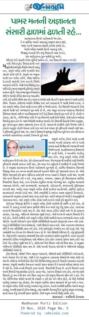 દોષ જોવાની, બીજાને નિમ્ન કક્ષાના ગણવાની, બીજાની સારી પરિસ્થિતિને વખોડવાની, મનને એકવાર ટેવ પડી જાય, પછી તે ટેવ અનુસારના નકારાત્મક વિચારોની અસર શરીર પર થાય છે. શરીરના અંગોની ક્રિયા પ્રૌઢ ઉંમરે શિથિલ થવાનું કારણ છે પોતાનો નકારાત્મક અહંકારી સ્વભાવ. પ્રભુની આત્મીય ચેતનાના આધારે જીવન જીવાય છે તે સત્યનો મહિમા જાણ્યાં વગર જે જીવે છે, તેઓ તનની બિમારી કરતાં મનની બિમારીથી પિડાય છે. તનની બિમારી કરતાં મનની બિમારી બધુ જીવલેણ હોય છે. કારણ ખોટ, ઉણપના વિચારો જ્યાં હોય, ત્યાં ભય સાથે ચિંતાનો કુંડ મન બની જાય અને ચિંતા કરતું મન કદી પ્રભુના ચિંતનમાં લીન થઈ ન શકે. જેમ એક એન્જિનીયર થયેલો માનવી જો કમાણી ન કરી શકે અને ભીખ માંગે, તો એણે મેળવેલી પદવીનું અપમાન થયું કહેવાય; તેમ પ્રભુમય સાત્ત્વિક જીવન જીવવાનો જો પુરુષાર્થ ન થાય, તો પ્રભુએ અર્પણ કરેલી પદવીનું અપમાન થયું કહેવાય. મનની પદવીથી સાત્ત્વિક ભાવને જાગૃત કરાવતું, માનવી સ્વરૂપની શોભા વધારતું, તથા આત્મીય ચેતનાનું દિવ્ય ગુણોનું પ્રભુત્વ પ્રગટાવતું, જ્ઞાની ભક્ત જેવું પરમાર્થી જીવન જીવીએ. જેથી મનુષ્ય જન્મની સિદ્ધિ સાર્થક થાય.