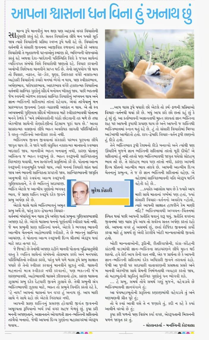 જે જિવાડે છે તેનાંથી અજાણ રહીને માનવી પોતાના બુદ્ધિચાતુર્યથી વસ્તુ, કે વ્યક્તિ સાથેના સંબંધનો તોલમાપ કરશે અને મનપસંદ પરિસ્થિતિનો સ્વીકાર કરશે. પરંતુ પળે પળે શ્વાસ રૂપે પ્રભુ સાક્ષાત્ પધારે છે તેનો સ્વીકાર કરવાનું માનવીને સૂઝતું નથી. શ્વાસની મહત્તાનો માત્ર સ્વીકાર નથી કરવાનો, પણ ભક્તની જેમ શરણભાવથી, અહોભાવથી શ્વાસને ઝીલવાનો હોય. કારણ શ્વાસના ઝૂલામાં પ્રભુ દરેક દેહધારી જીવને ઝુલાવે છે. તેથી પ્રભુની સંગ ભકિતભાવથી ઝૂલવા માટે, ભક્ત તો પ્રભુને વિનંતિ કરતો રહે કે,“ હૈ નાથ! આપનાં શ્વાસનાં ધન વગર હું અનાથ છું. આપ મારી સાથે ને સાથે રહો છો એટલે નિરાધાર નથી. આપની પ્રાણ શક્તિનું પ્રસરણ હોવાથી જીવંત જીવનની અમૂલ્યતા રૂપિયાનો ખર્ચ કર્યા વગર સહજ મેળવું છું. કૃપા કરી મનની અજાણતાને, અજ્ઞાનતાને ઓગાળતી જ્ઞાન-