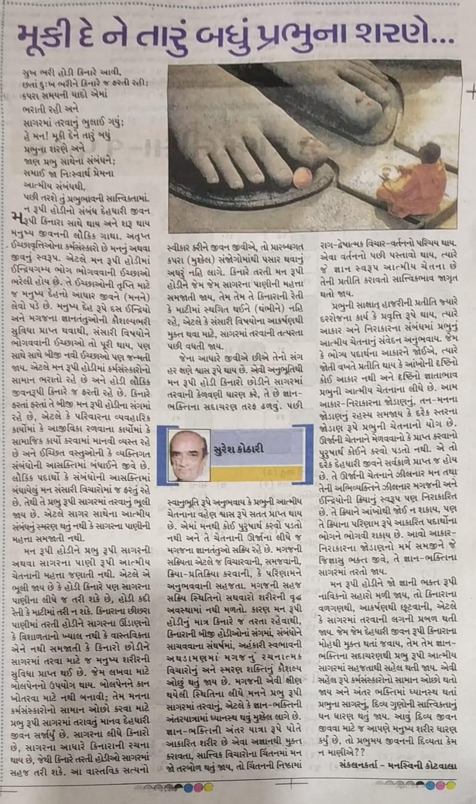 પ્રભુની સાક્ષાત્ હાજરીની પ્રતીતિ જ્યારે દરરોજના કાર્ય કે પ્રવૃત્તિ રૂપે થાય, ત્યારે આકાર અને નિરાકારના સંબંધમાં પ્રભુનું આત્મીય ચેતનાનું સંવેદન અનુભવાય. જેમકે ભોગ્ય પદાર્થના આકારને જોઈએ, ત્યારે જોતી વખતે પ્રતીતિ થાય કે આંખોની સૃષ્ટિનો કોઈ આકાર નથી અને દૃષ્ટિનો જ્ઞાતાભાવ પ્રભુની આત્મીય ચેતનાના લીધે છે. આમ આકાર-નિરાકારના જોડાણનું, તનમનનાં જોડાણનું રહસ્ય સમજાય કે દરેક સ્તરના જોડાણ રૂપે પ્રભુની ચેતનાનો યોગ છે. ઊર્જાની ચેતનાને મેળવવાનો કે પ્રાપ્ત કરવાનો પુરુષાર્થ કોઈને કરવો પડતો નથી. એ તો દરેક દેહધારી જીવને સર્વકાળે પ્રાપ્ત જ હોય છે. તે ઊર્જાની ચેતનાને ઝીલનાર મન તથા તેની અભિવ્યક્તિને ઝીલનાર મગજની અને ઇન્દ્રિયોની ક્રિયાનું સ્વરૂપ પણ નિરાકારિત છે. તે ક્વિાને આંખોથી જોઈ ન શકાય, પણ તે ક્રિયાના પરિણામ રૂપે આકારિત પદાર્થોના ભોગને ભોગવી શકાય છે. આવો આકાર-નિરાકારના જોડાણનો મર્મ સમજીને જે જિજ્ઞાસુ ભક્ત જીવે, તે જ્ઞાન-ભક્તિના સાગરમાં તરતો જાય. મન રૂપી હોડીને જો જ્ઞાની ભકત રૂપી નાવિકનો સહારો મળી જાય, તો કિનારાના વળગણથી, આર્ષણથી છૂટવાની, એટલે કે સાગરમાં તરવાની લગની પ્રબળ થતી જાય. જેમ જેમ દેહધારી જીવન રૂપી કિનારાના મોહથી મુક્ત થતાં જવાય, તેમ તેમ જ્ઞાન-ભક્તિના સદાચરણથી પ્રભુ રૂપી આત્મીય સાગરમાં સહજતાથી સહેલ પતી જાય. એવી સહેલ રૂપે કર્મસંસ્કારોનો સામાન ઓછો થતો જાય અને અંતર ભક્તિમાં ધ્યાનસ્થ થતાં પ્રભુના સાગરનું, દિવ્ય ગુણોની સાત્ત્વિકતાનું ધન ધારણ થતું જાય. આવું દિવ્ય જીવન જીવવા માટે જ આપણે મનુષ્ય શરીર ધારણ કર્યું છે, તો પ્રભુમય જીવનની દિવ્યતા કેમ ન માણીએ ??
