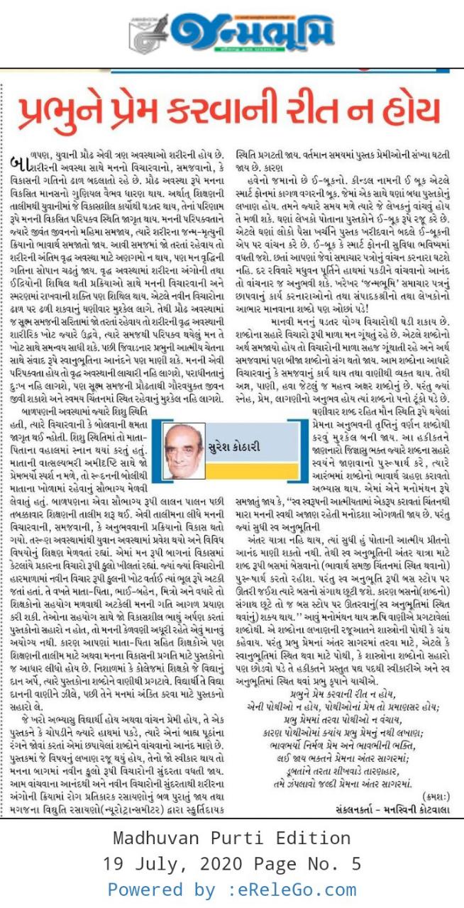 જે ખરો અભ્યાસુ વિદ્યાર્થી હોય અથવા વાંચન પ્રેમી હોય, તે એક પુસ્તકને કે ચોપડીને જ્યારે હાથમાં પકડે, ત્યારે એનાં બાહ્ય પૂઠાંના રંગને જોવાં કરતાં એમાં છપાયેલાં શબ્દોને વાંચવાનો આનંદ માણે છે. પુસ્તકમાં જે વિષયનું લખાણ રજૂ થયું હોય, તેનો જો સ્વીકાર થાય તો મનના બાગમાં નવીન ફુલો રૂપી વિચારોની સુંદરતા વધતી જાય. આમ વાંચવાના આનંદથી અને નવીન વિચારોની સુંદરતાથી શરીરના અંગોની ક્રિયામાં રોગ પ્રતિકારક રસાયણોનું બળ પુરાતું જાય તથા મગજના વિદ્યુતિ રસાયણો(ન્યૂરોટ્રાન્સમીટર) દ્વારા સ્ફુર્તિદાયક સ્થિતિ પ્રગટતી જાય. વર્તમાન સમયમાં પુસ્તક પ્રેમીઓની સંખ્યા ઘટતી જાય છે. કારણ હવેનો જમાનો છે ઈ-બૂકનો. કીન્ડલ નામની ઈ બૂક એટલે સ્માર્ટ ફોનમાં કાગળ વગરની બૂક. જેમાં એક સાથે ઘણાં બધા પુસ્તકોનું લખાણ હોય. તમને જ્યારે સમય મળે ત્યારે જે લેખકનું વાંચવું હોય તે મળી શકે. ઘણાં લેખકો પોતાના પુસ્તકોને ઈ-બૂક રૂપે રજૂ કરે છે. એટલે ઘણાં લોકો પૈસા ખર્ચીને પુસ્તક ખરીદવાને બદલે ઈ-બૂકની એપ પર વાંચન કરે છે. ઈ-બૂક કે સ્માર્ટ ફોનની સુવિધા ભવિષ્યમાં વધતી જશે. છતાં આપણાં જેવાં સમાચાર પત્રોનું વાંચન કરનારા ઘટશે નહિ. દર રવિવારે મધુવન પૂર્તિને હાથમાં પકડીને વાંચવાનો આનંદ તો વાંચનાર જ અનુભવી શકે. ખરેખર `જન્મભૂમિ' સમાચાર પત્રનું છાપવાનું કાર્ય કરનારાઓનો તથા સંપાદકશ્રીનો તથા લેખકોનો આભાર માનવાના શબ્દો પણ ઓછાં પડે!