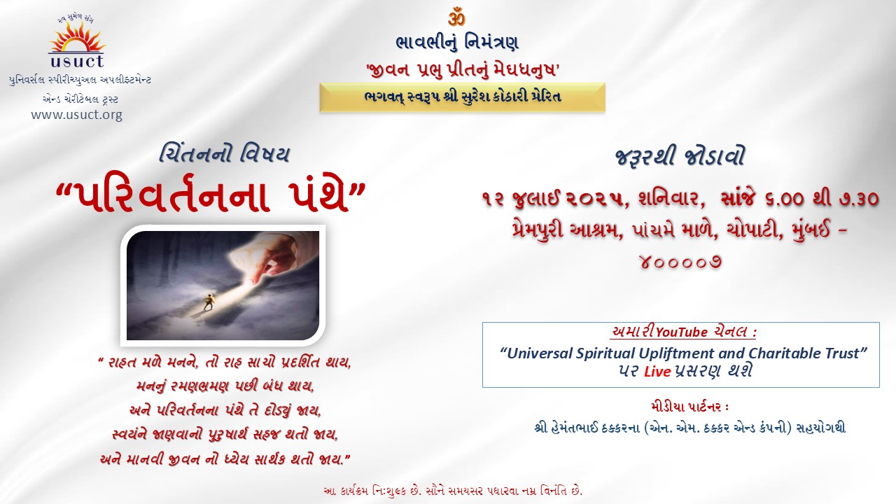 Invitation for Spiritual Discourse Universal Spiritual Upliftment and Charitable Trust is pleased to inform that it is organising Bhakti Satsang gatherings on Saturday from 6.00 pm to 7.30 pm beginning from Saturday 12th July 2025. Topic of discussion is “Parivartan na Panthe”