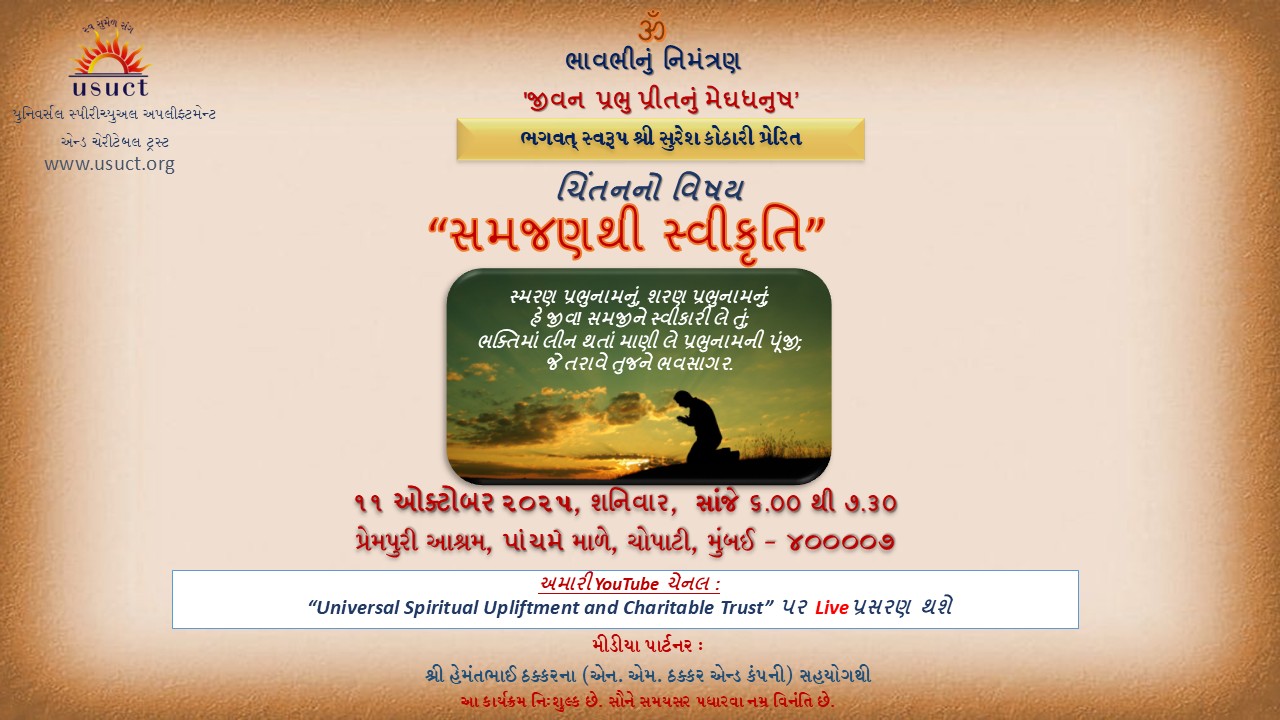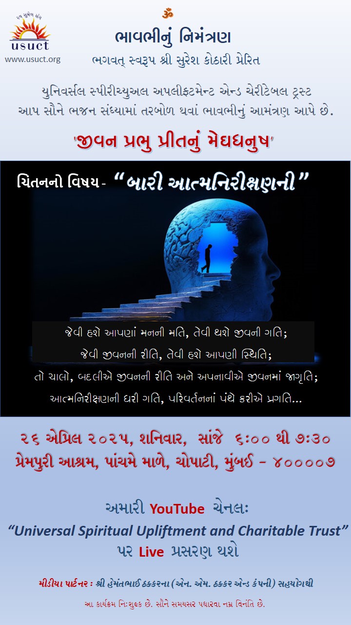 અમારી YouTube ચેનલ : “Universal Spiritual Upliftment and Charitable Trust” પર Live પ્રસરણ થશે