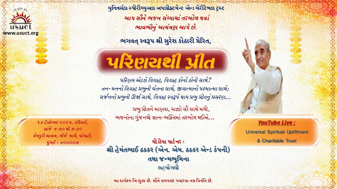 Invitation for Spiritual Discourse Universal Spiritual Upliftment and Charitable Trust is pleased to inform that it is organising Bhakti Satsang from 5.30 pm to 7.30 pm beginning 14th December 2025. Topic of discussion is “Parinay thi Preet”